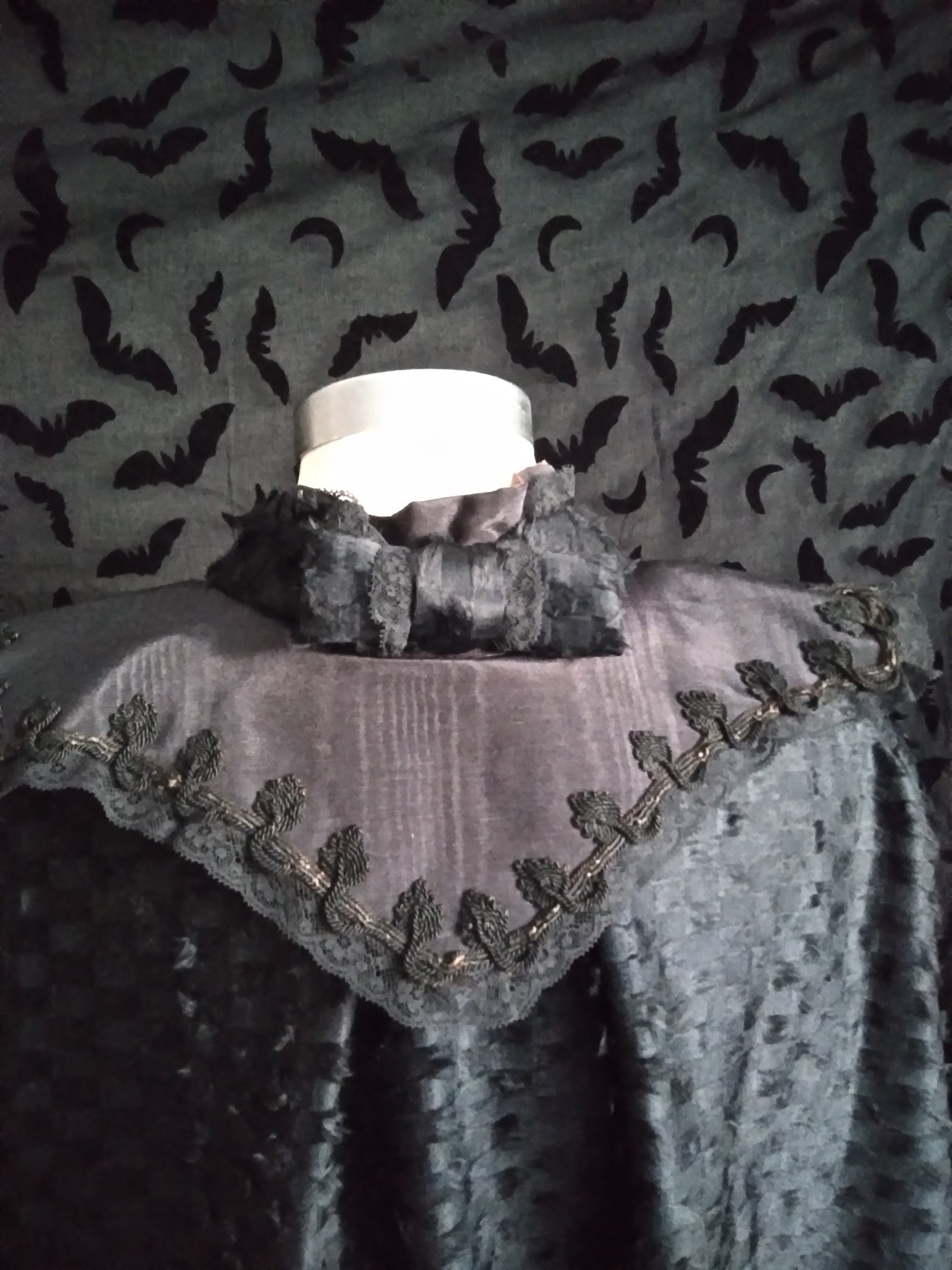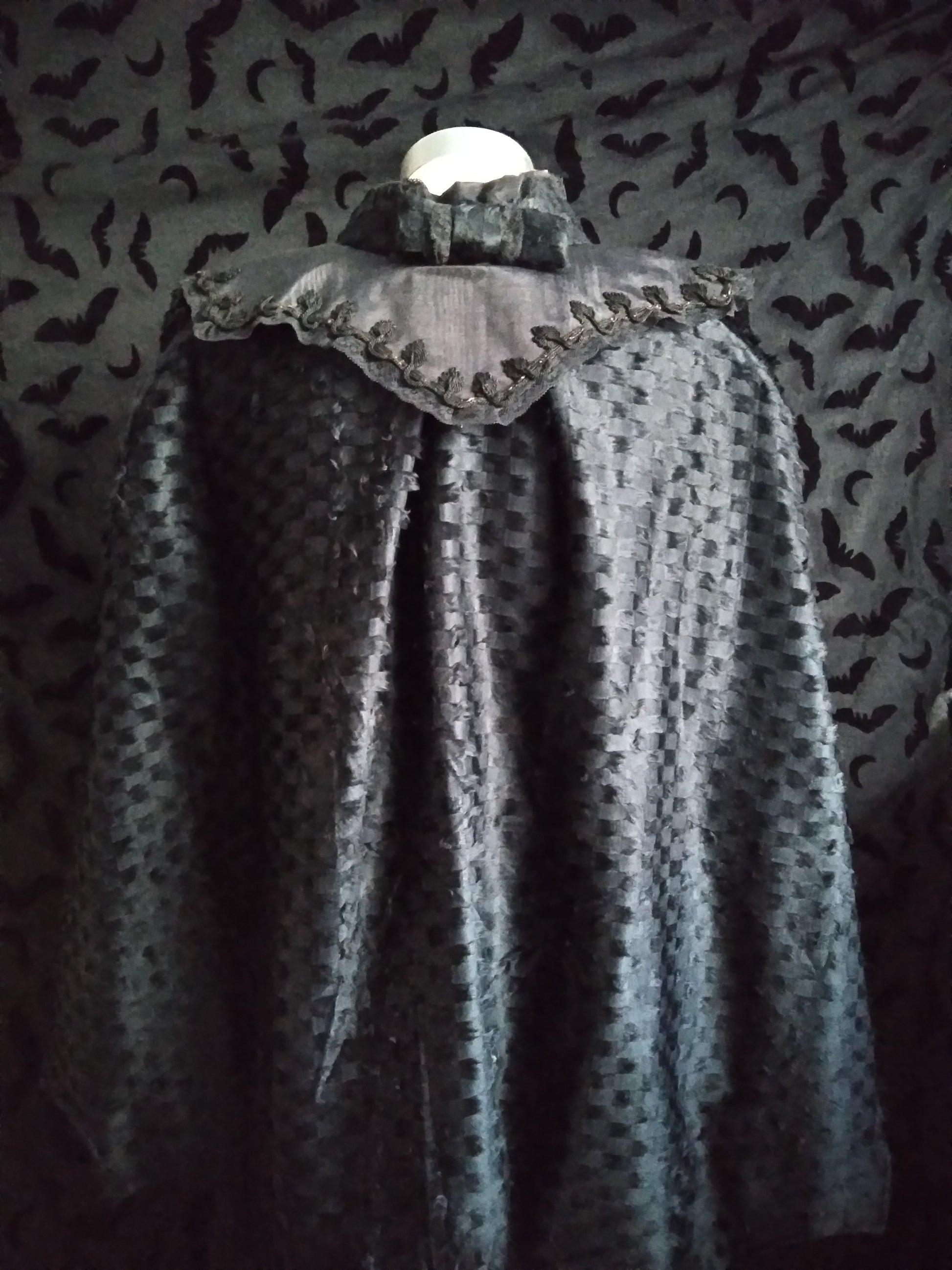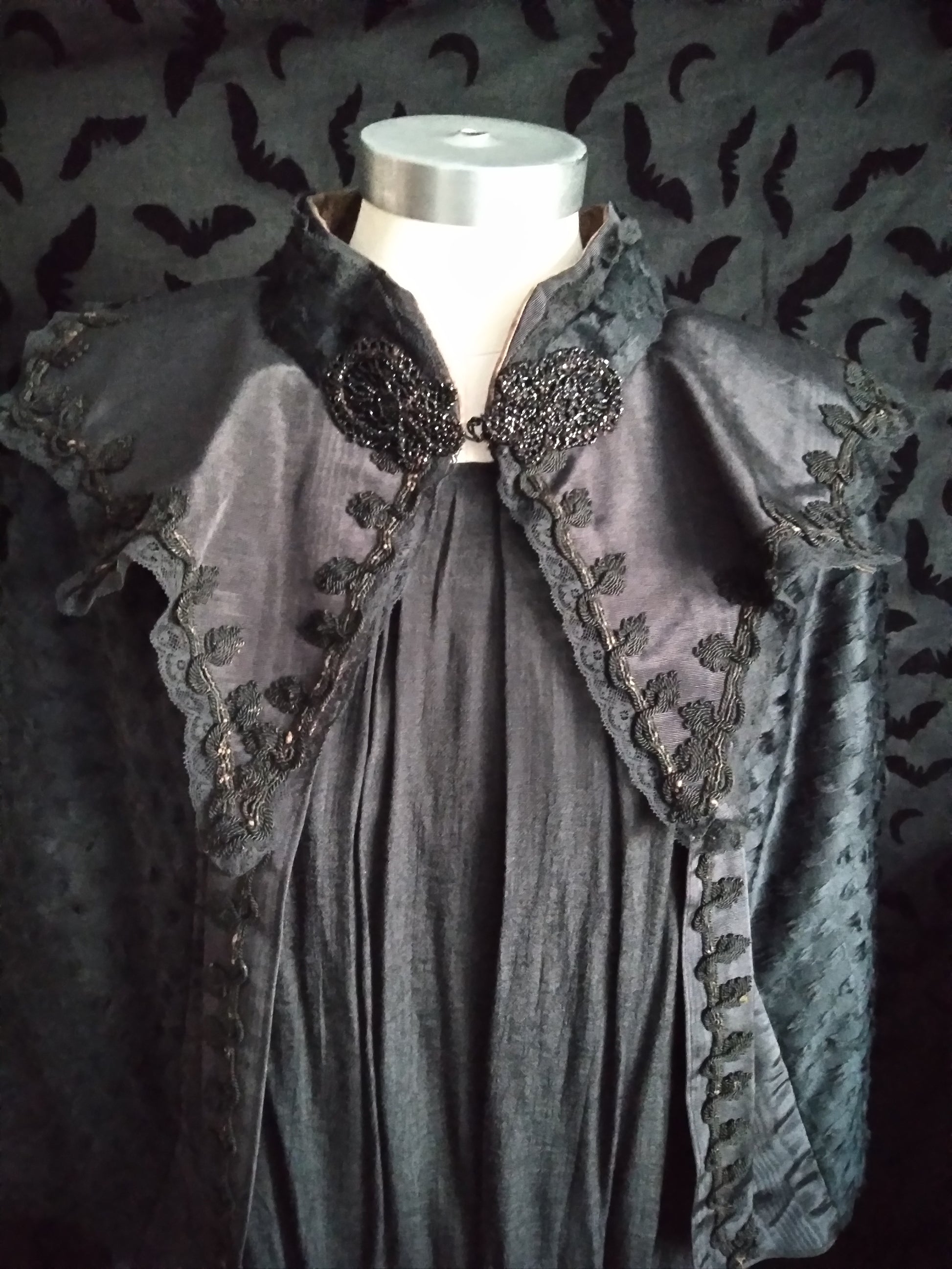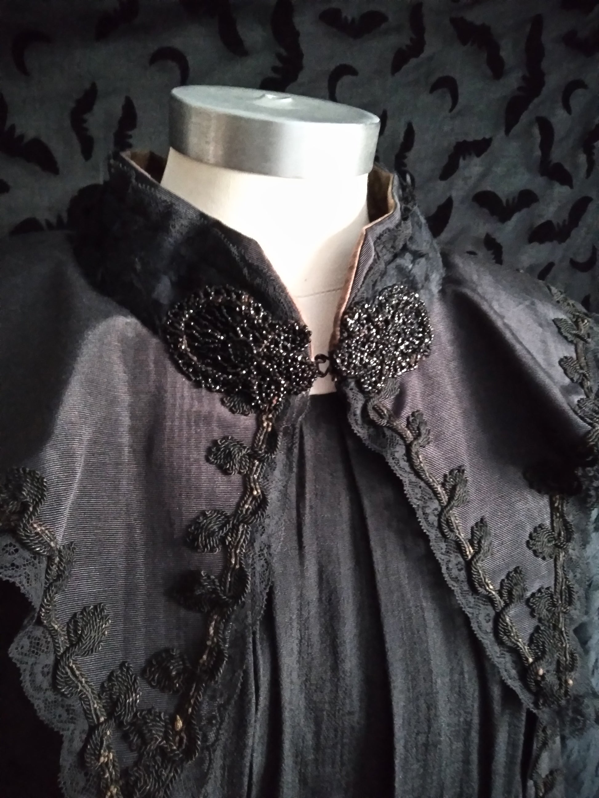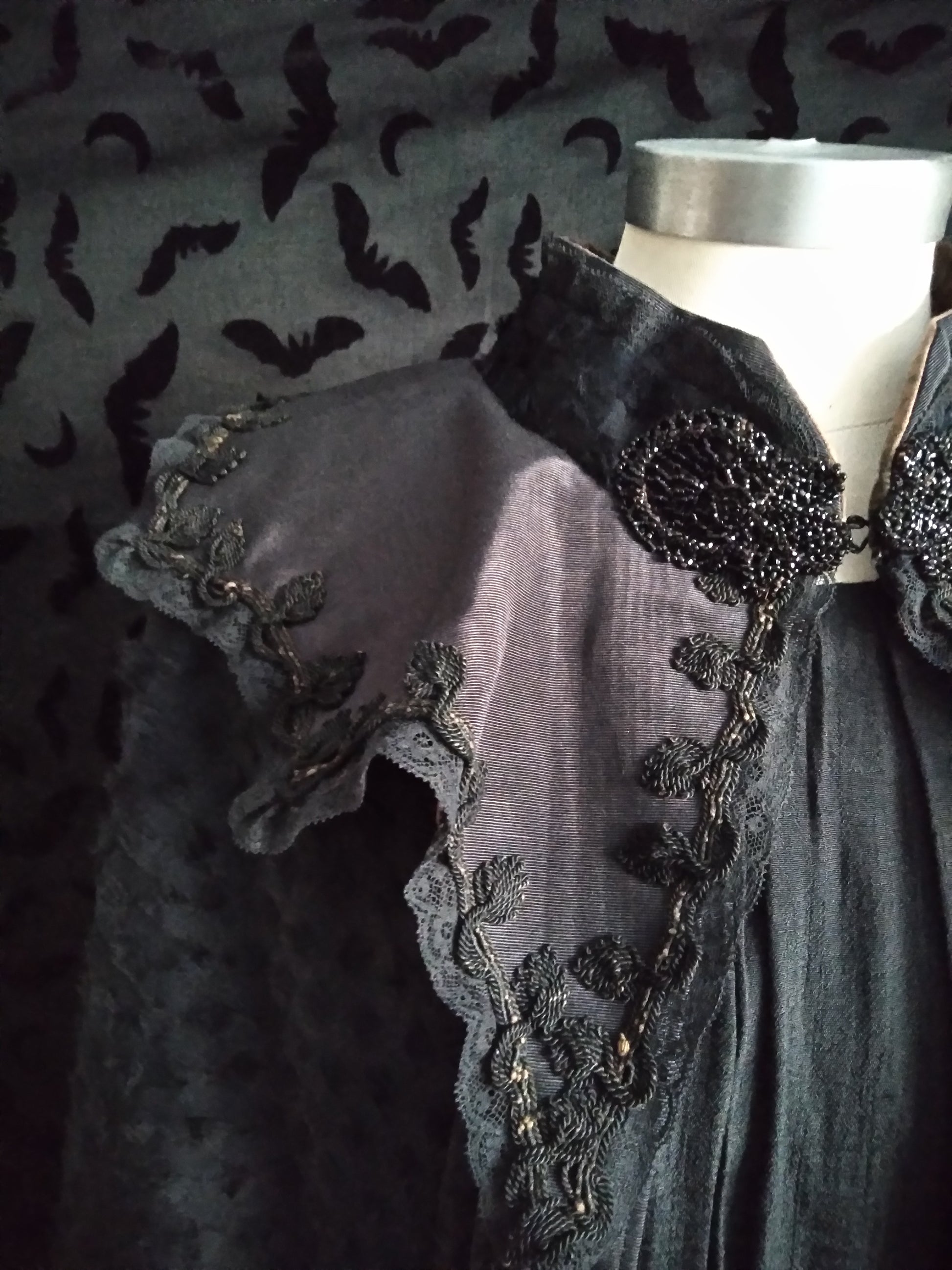 Made from antique deadstock fabric (likely from the 1920s), vintage cotton lining fabric, moire fabric, antique salvaged applique soutache trim, vintage lace, salvaged beaded appliques.