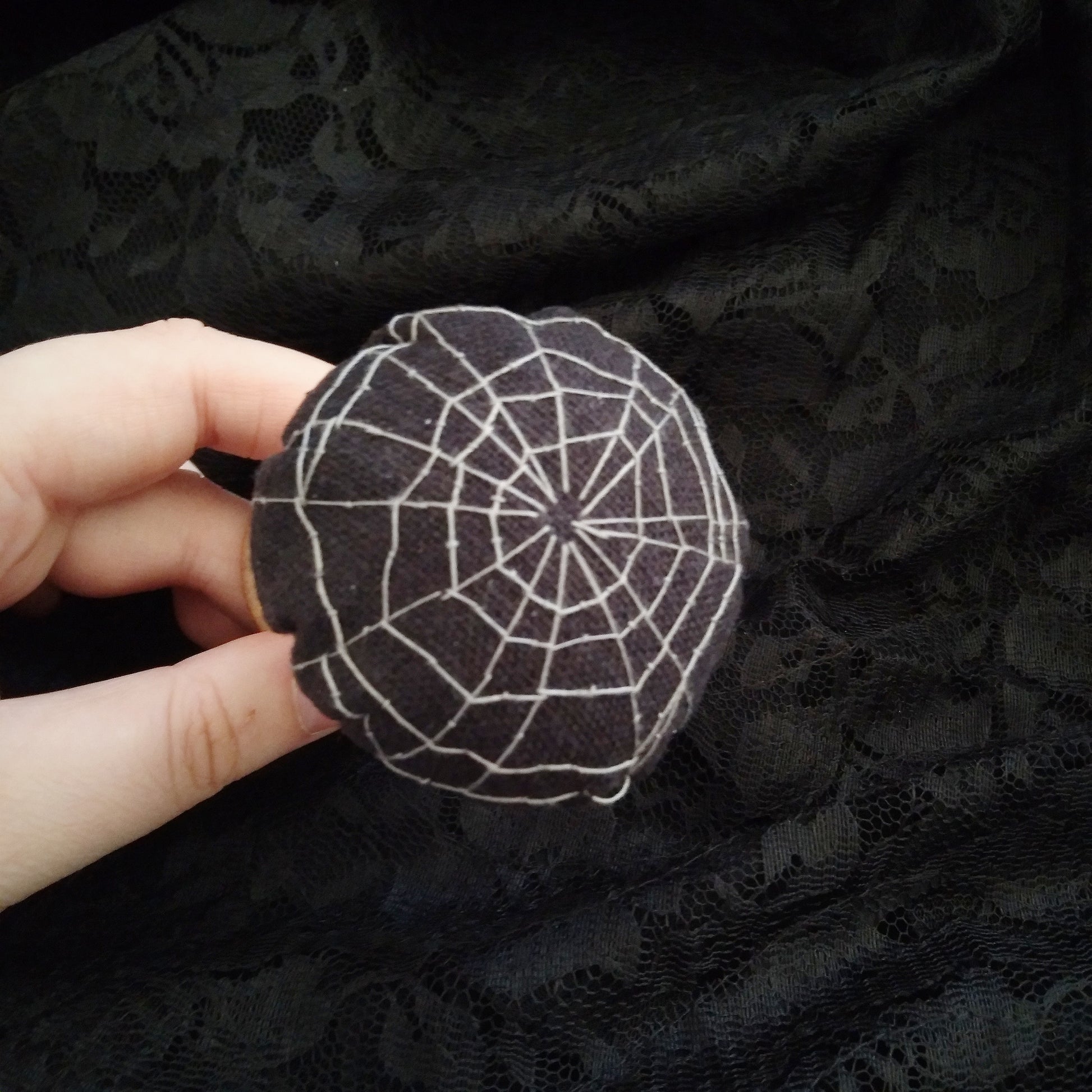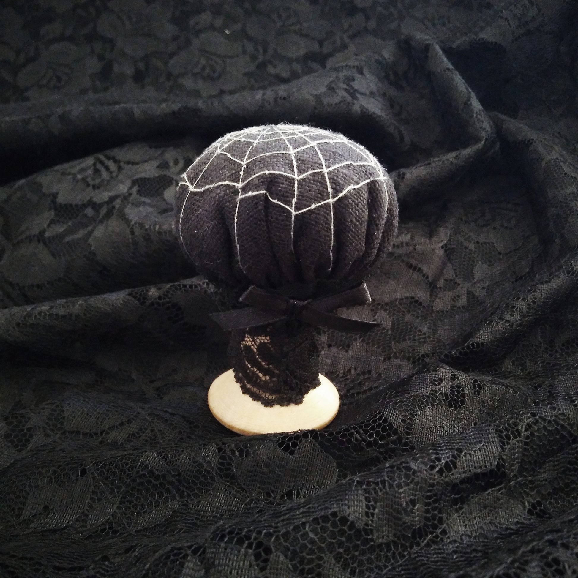 Made with black linen, scrap black lace, and a antique wooden thread spool. Filled with crushed walnut shells and scrap wool batting for shape.