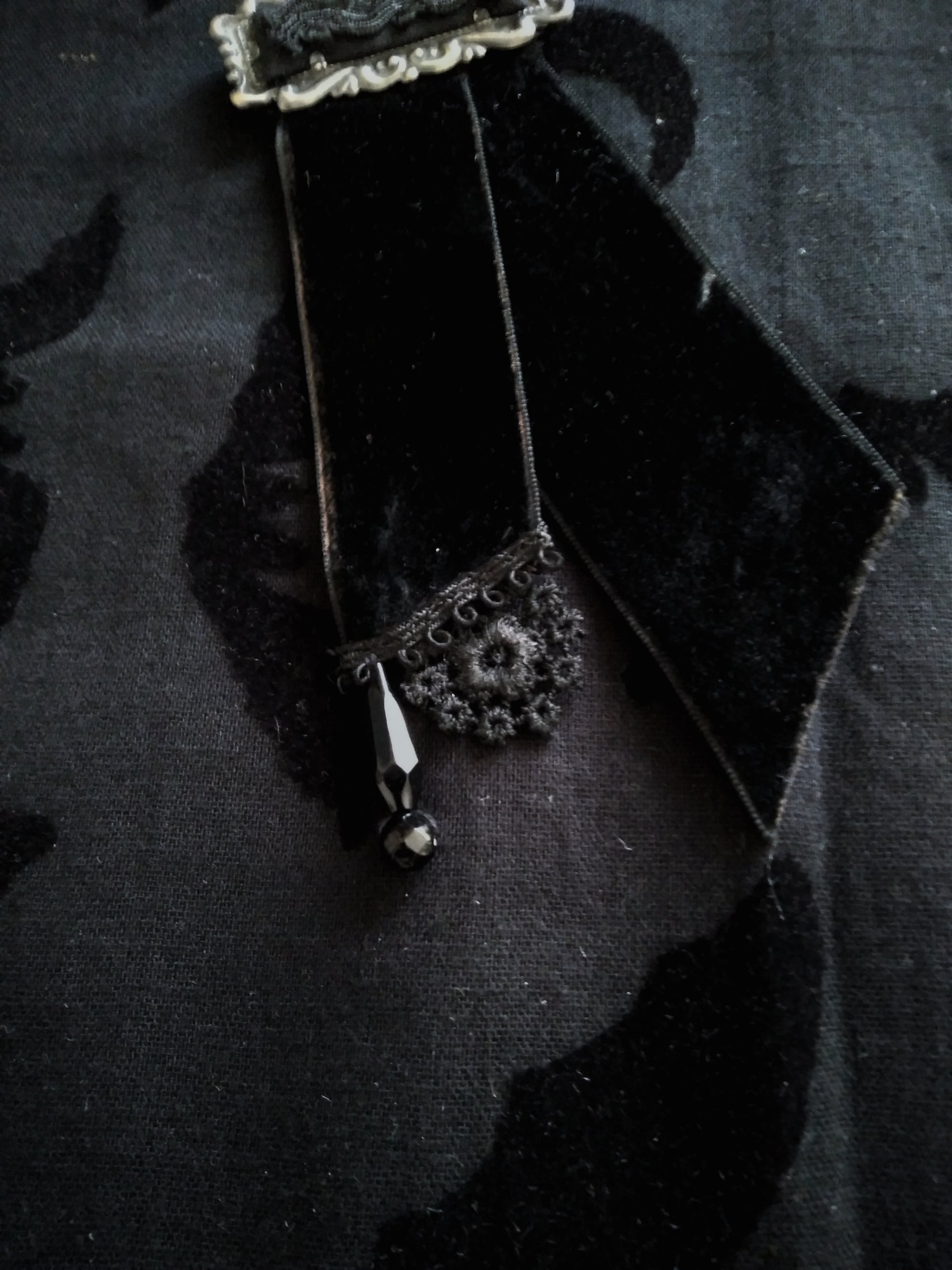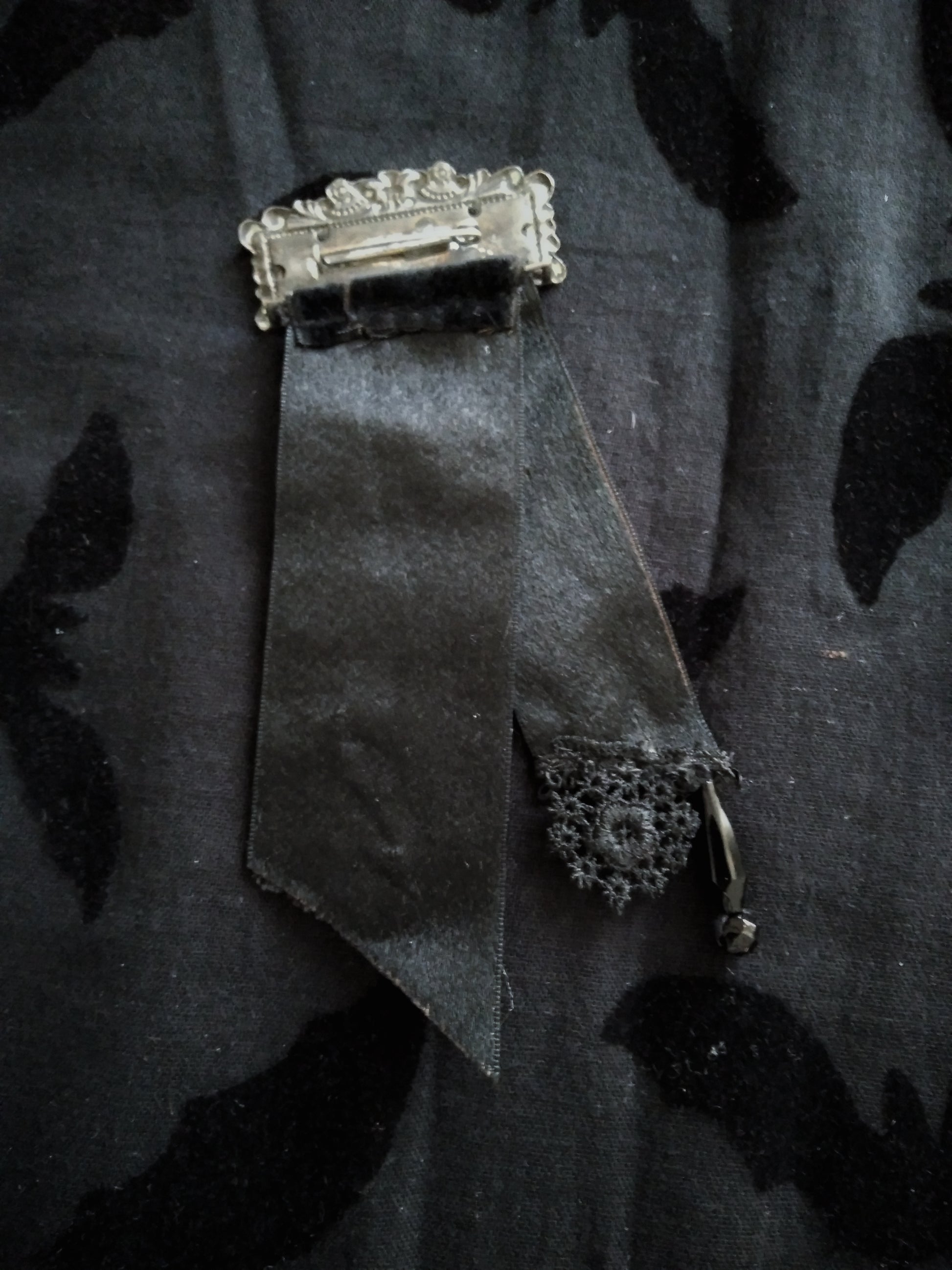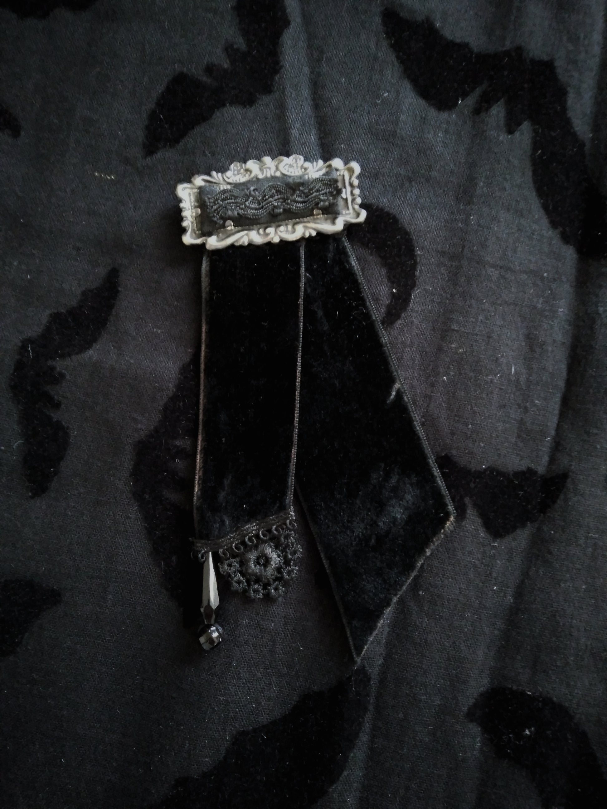Made with vintage ribbon badge, scrap trim, antique silk velvet ribbon, trim scraps and jet beads.