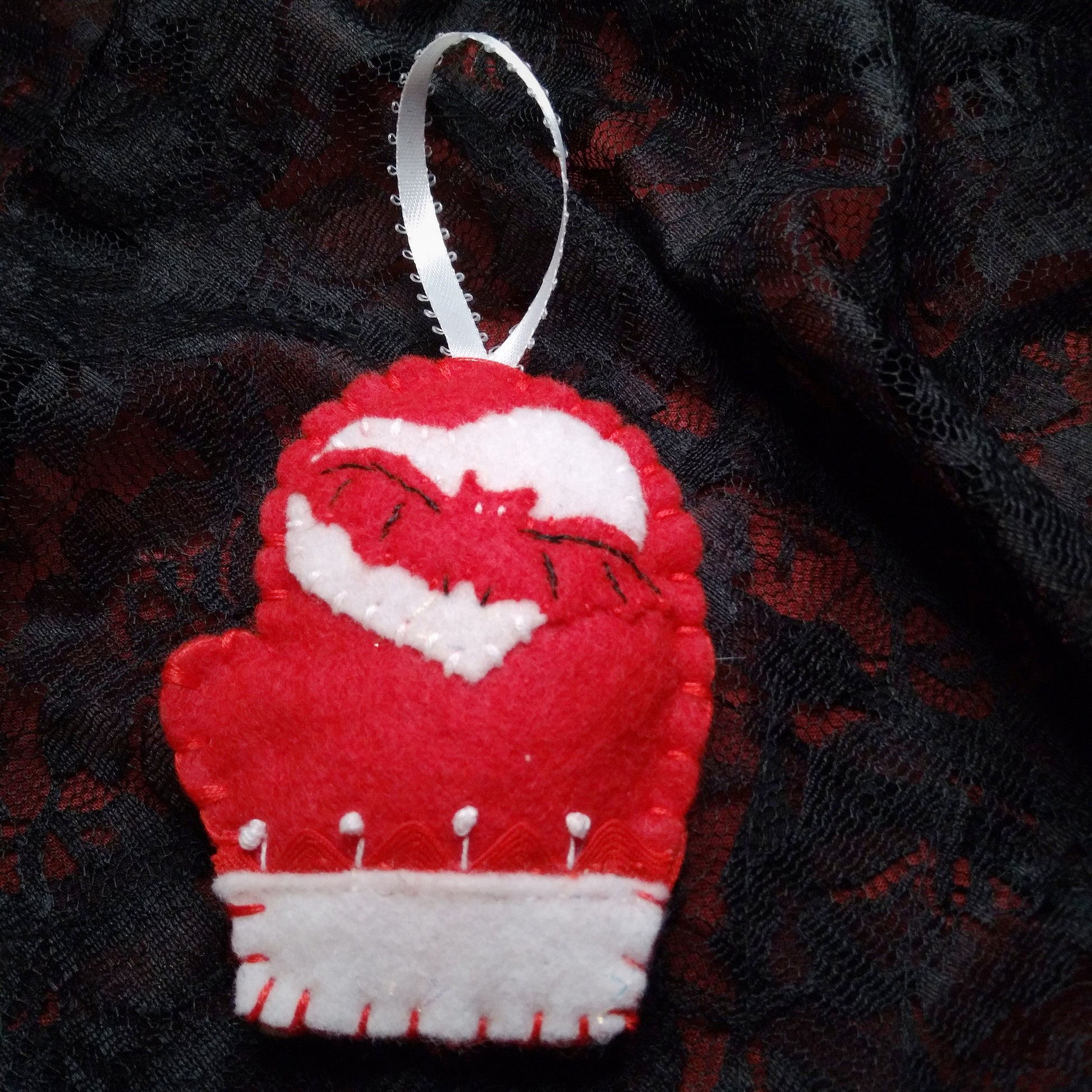 Made from red and white felt, red rickrac, cotton embroidery thread and satin ribbon.