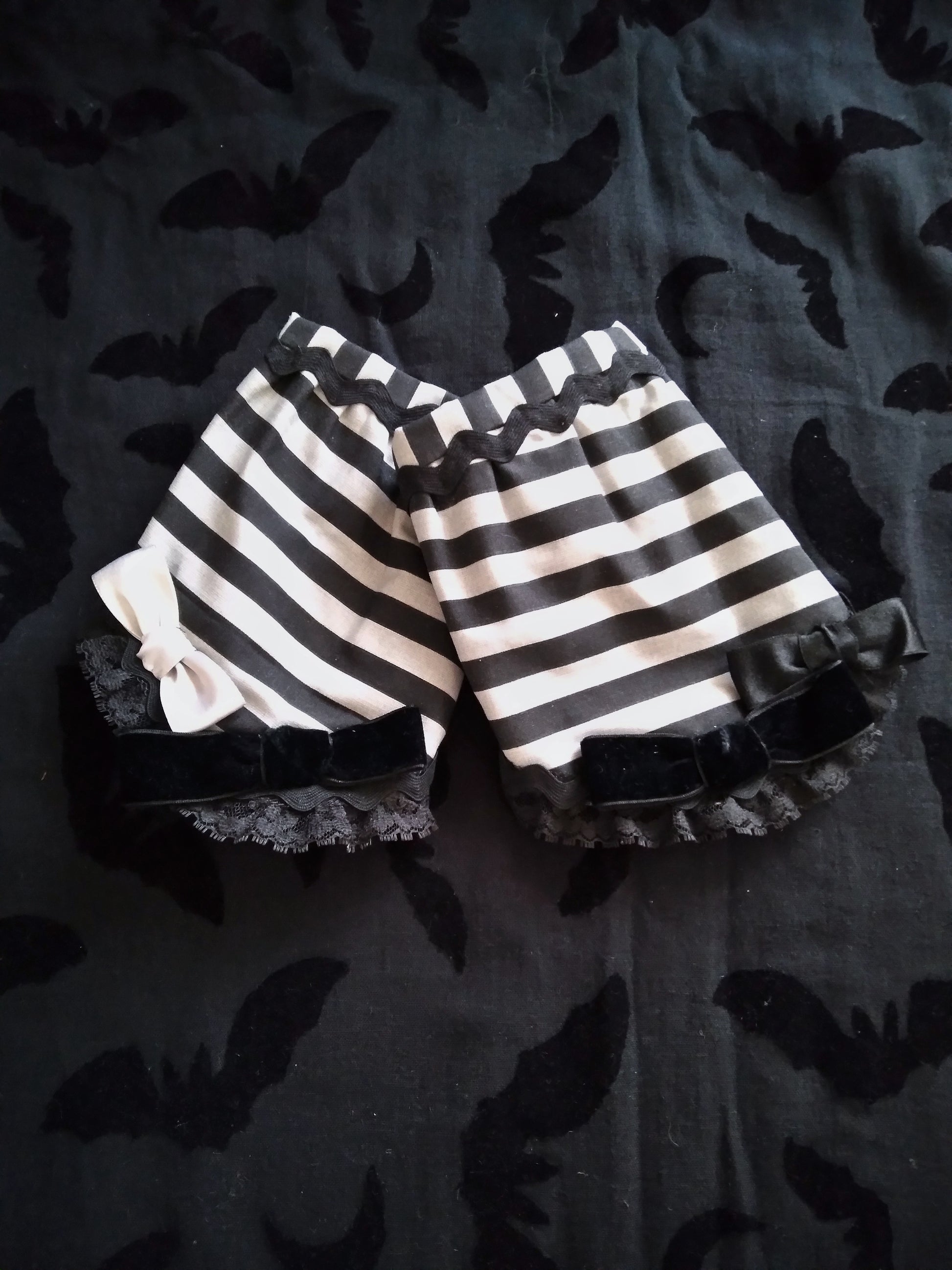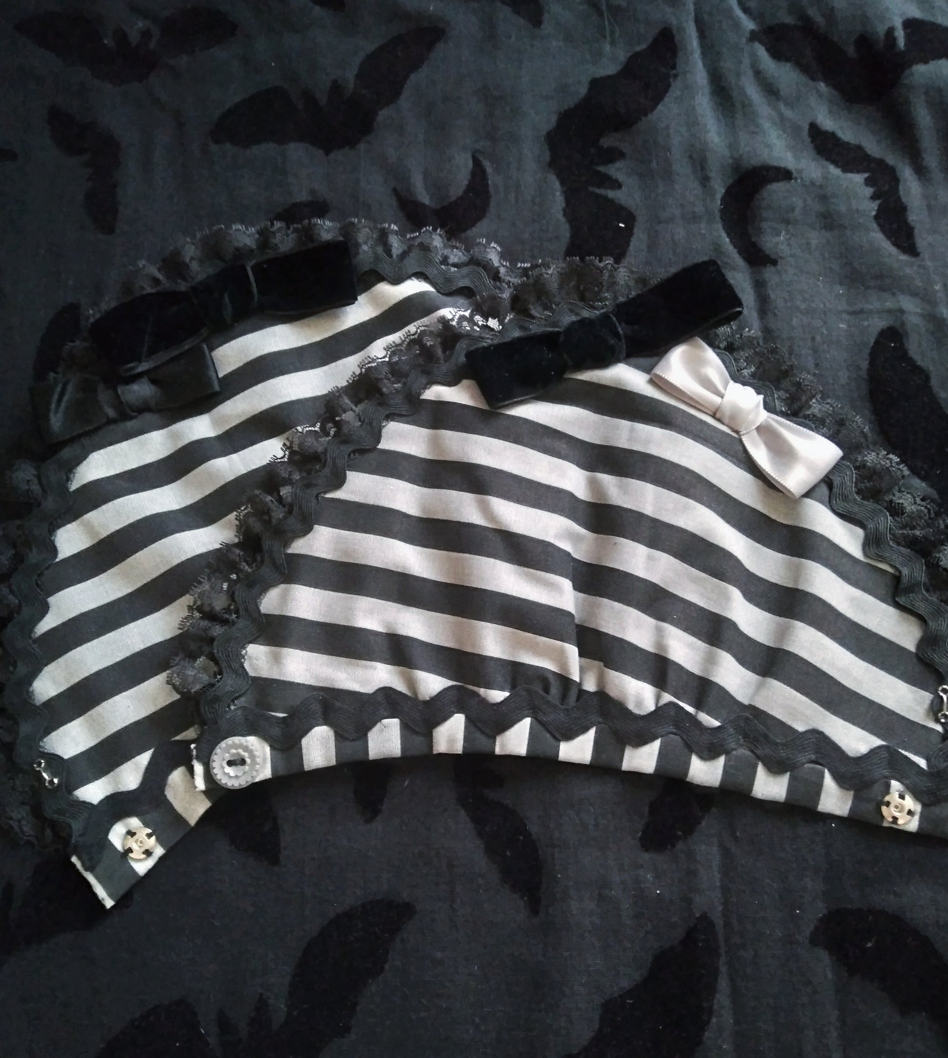 Made of patterned cotton, cotton inside lining, ric rac trim, vintage black lace, vintage plastic buttons, satin/velvet ribbons (Ribbons are mismatches on purpose.)