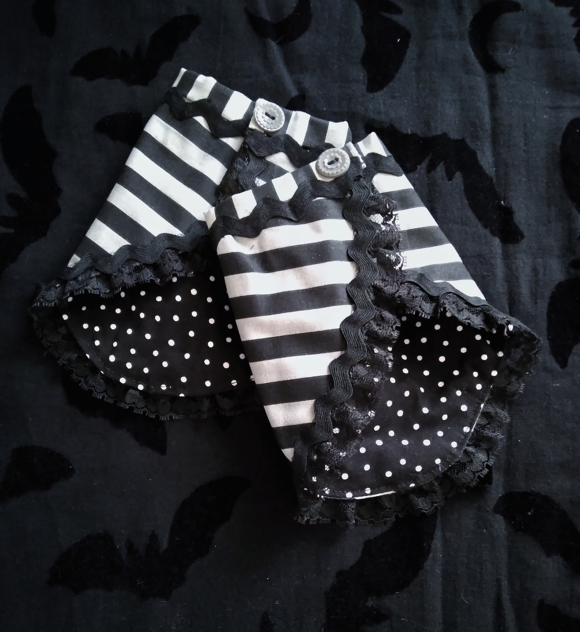 Detachable wrist cuffs, perfect to add a dark twist to any outfit. These are mainly meant to be worn under existing sleeves, like a sleeve extender. Can be worn by by themselves but doesn't give the same effect.