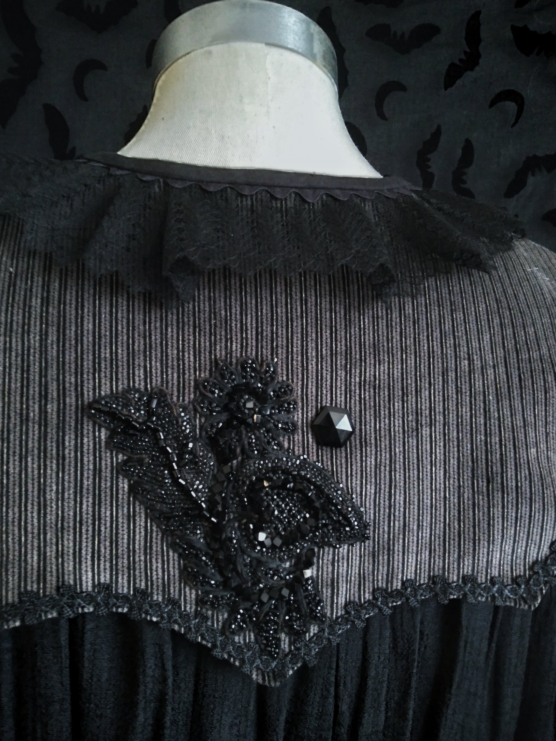 Made of vintage striped corduroy, lined in black cotton, trim is deadstock, antique lace with antique salvaged beaded applique and antique jet beads for some sparkle in these dark times.