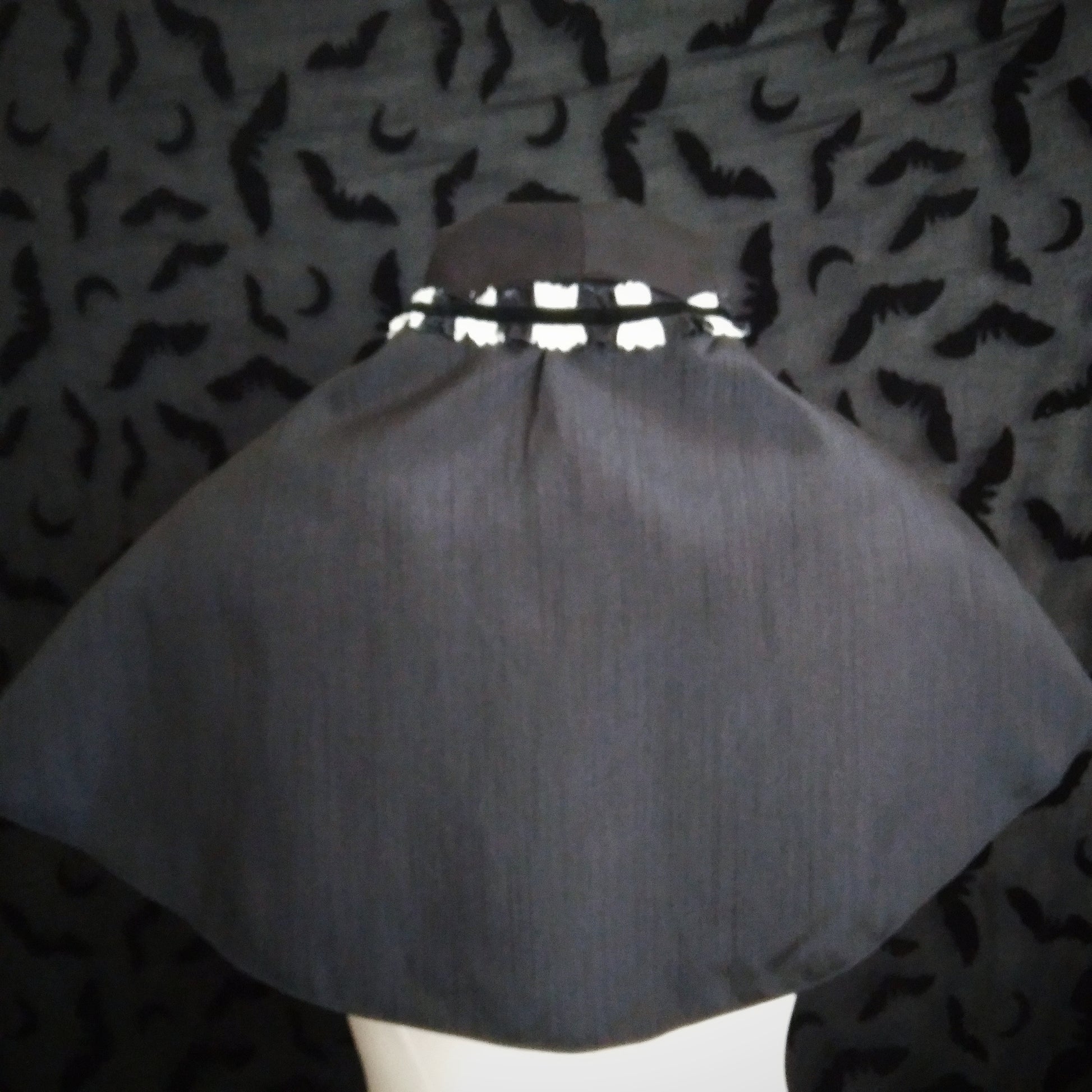 This capelet is heavily inspired by Victorian mourning capelets from the 1890s. The outer fabric is poly silk taffeta, striped cotton lining. The striped trim is cotton, the velvet ribbon is antique. The little bobbles at the end of the velvet ribbons are also antique. The striped fabric is new age, I bought it years ago from some fabric store.