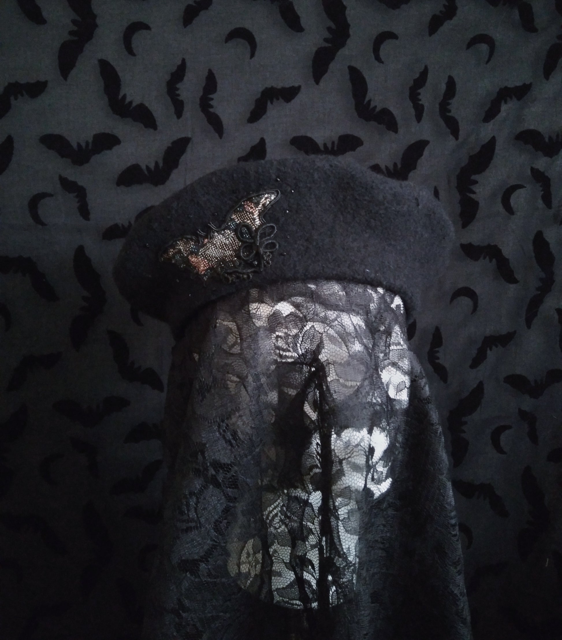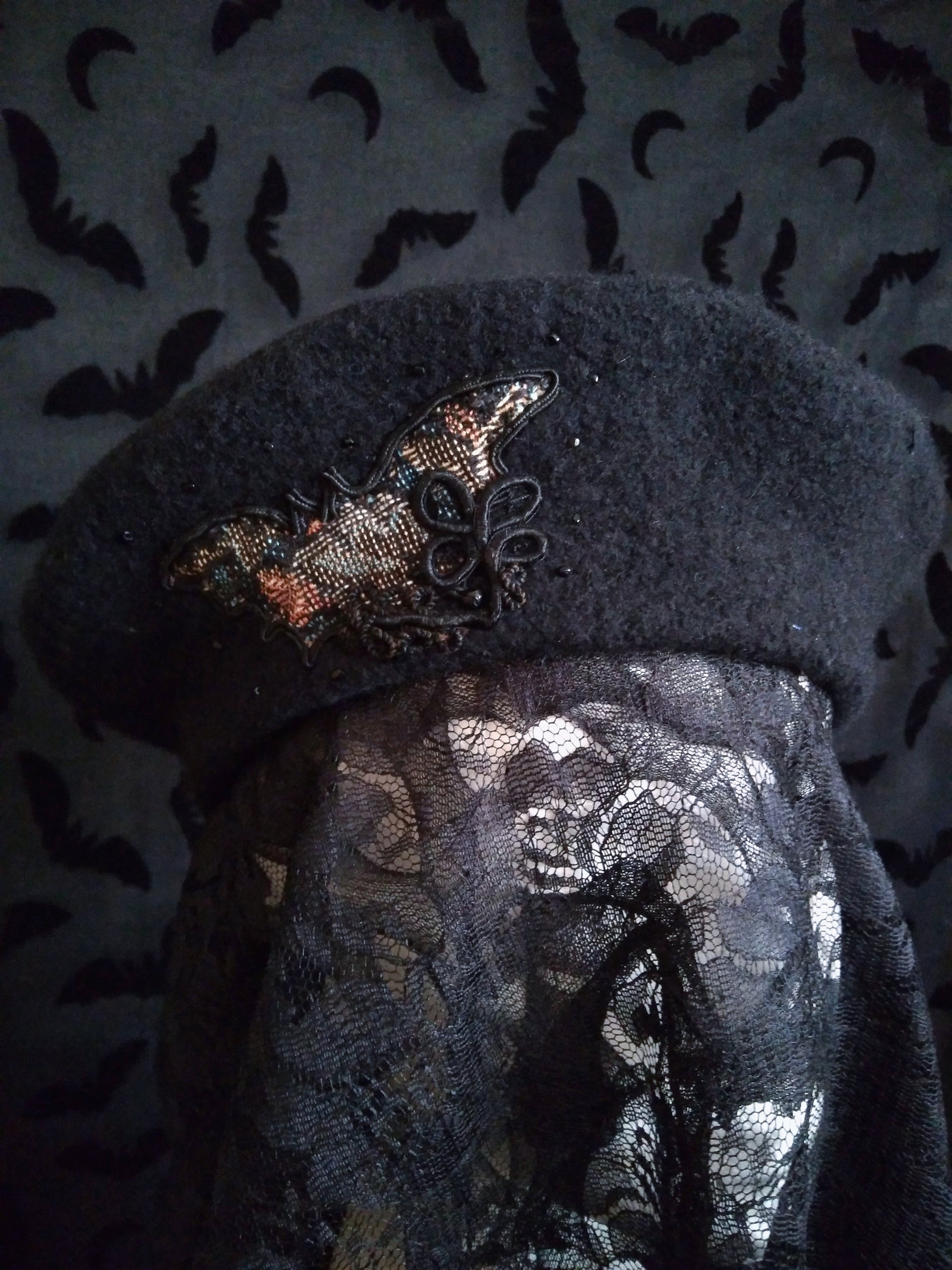 Made with a black 100% wool beret, floral tapestry fabric, vintage appliques, deadstock soutache braid, and antique jet beads.