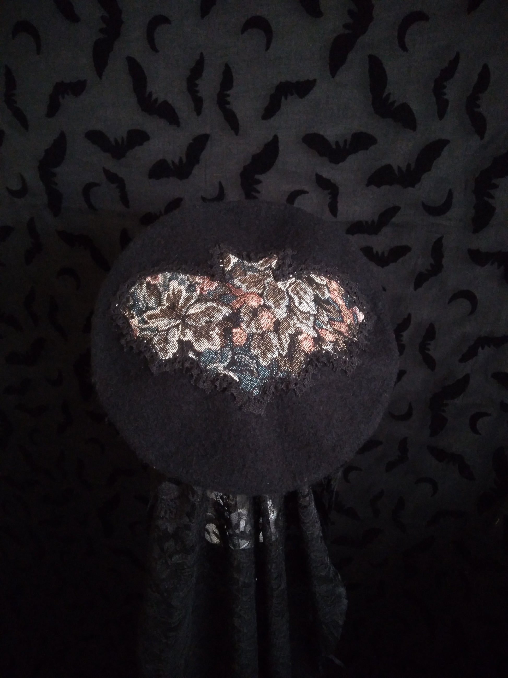 This beret was decorated with: floral tapestry scraps, cotton lace and silk velvet.